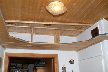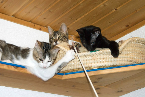 eingebaut. Im Haus sorgen außerdem so genannte "Katzenstrassen" unter der Decke für Abwechslung. Mit Teppichboden beklebt rutscht die Katze selbst bei Akrobatikübungen nicht. Da Katzen sehr neugierige, aber auch sehr vorsichtige Wesen sind, fühlen sie sich dort oben sicher und sind doch mitten im Geschehen. Von hier aus wird jeder Besucher, egal ob 2- oder 4-beinig zuerst einmal in Augenschein genommen. |
